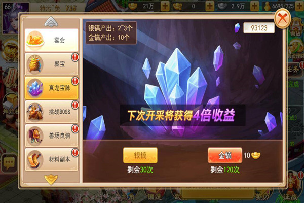 玩家每天都有数次机会通过免费的方式开采龙脉。元宝开采收益大几率翻倍。