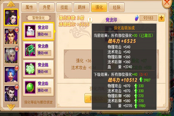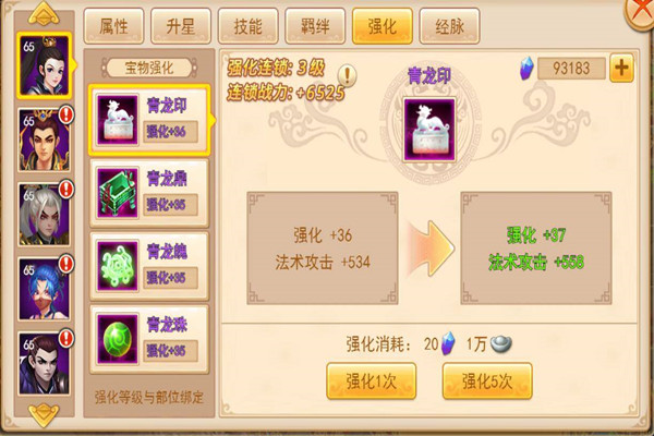 龙脉所得的强化石将适用于玩家人物的宝物强化。每个宝物的强化都会增加自身属性以及整体的成长机制。玩家在单个武将的所有宝物强化到十、二十、三十···等整数倍时还会获得额外的加成!