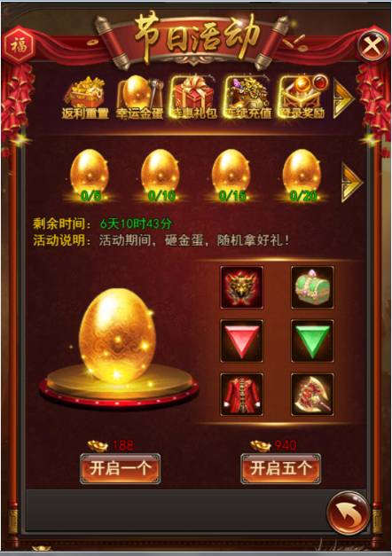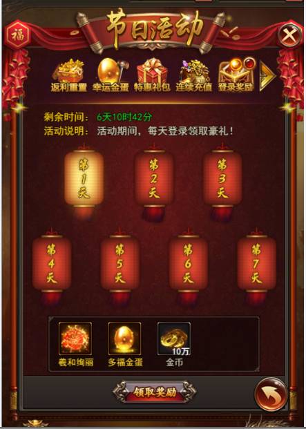 第5天:成长丹*50、多福金蛋*2、金币*150w、龙魂碎片*20