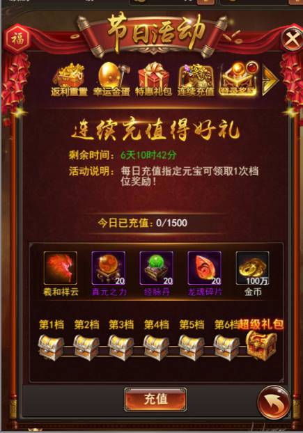 每日充值指定元宝可领取1次档位奖励(额度为1500元宝)