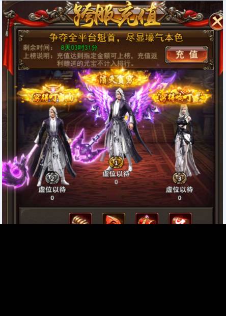 第1名:称号“消灭贫穷”*1、神器·升阳*5、红色至尊图鉴*3、红色符文宝箱*3(充值大于等于10w元宝可参与排行)