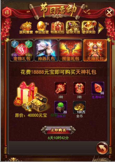 天神礼包(18888元宝):天神剑(1阶)*1、天神甲(1阶)*1、龙魂碎片*50、经脉丹*20、金币*100w