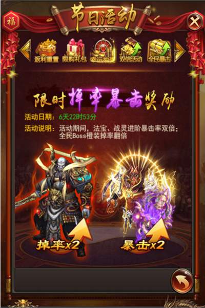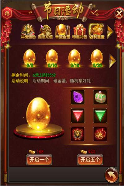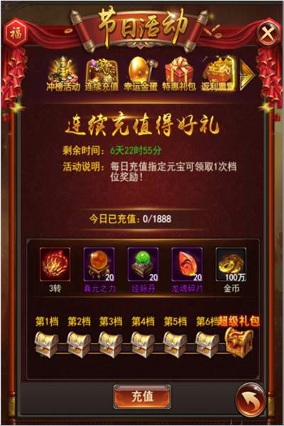 第6档:特级符文宝箱*1、真元之力*20、经脉丹*20、龙魂碎片*20、金币100w