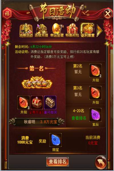 第1名:升阳*3、至尊图鉴包*1、富可敌国(称号)