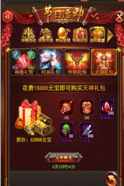 天神礼包(18888元宝):天神剑*1、天神甲*1、天神碎片*200、经脉丹*50、羽毛*500