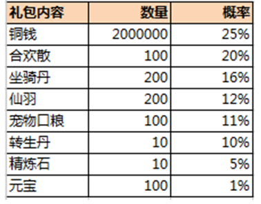 礼包内容:仙羽*300、坐骑丹*300、精炼石*6、神装精华*500、升星石*100