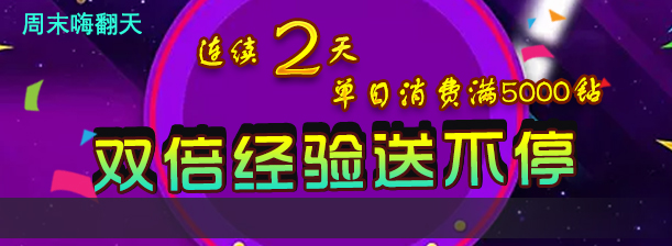 活动内容:活动期间,双倍经验,让您冲级High翻天,消费5000钻石便可开启!