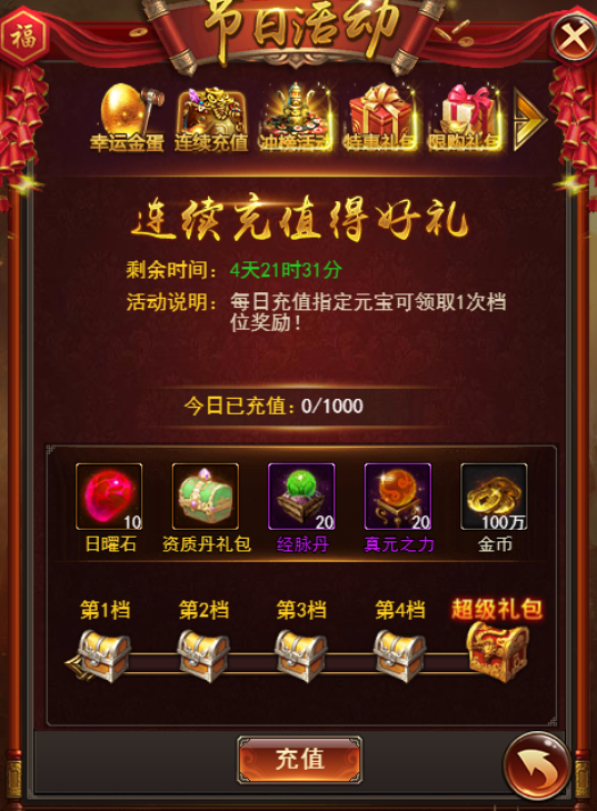 活动期间,每天充值一定金额,即可领取一次档位礼包