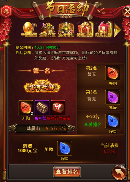活动期间参与排行榜可以获得丰厚的奖励,消费元宝达到1万即可上榜争夺排行榜名次,排名越高奖励越多哦