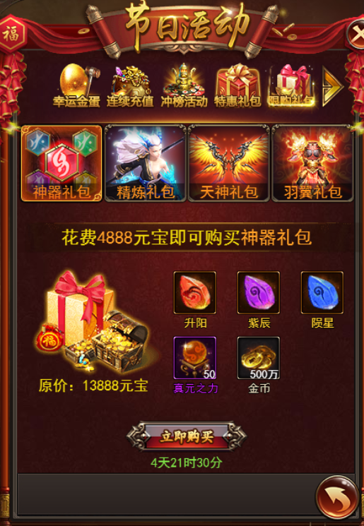 神器礼包(4888元宝):升阳*1 紫辰*1 陨星*1 真元之力*50 金币*500万