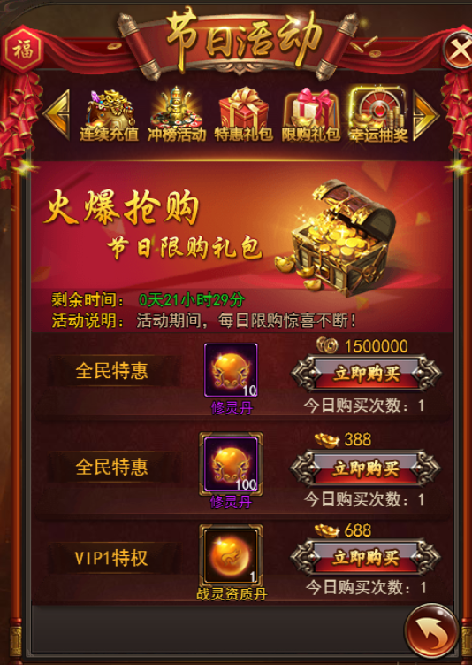 活动期间每天都会出售不同的限购礼包,遇到赚到!