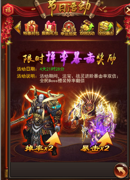 活动期间,法宝,战灵进阶暴击率双倍,全民boss橙装暴率翻倍