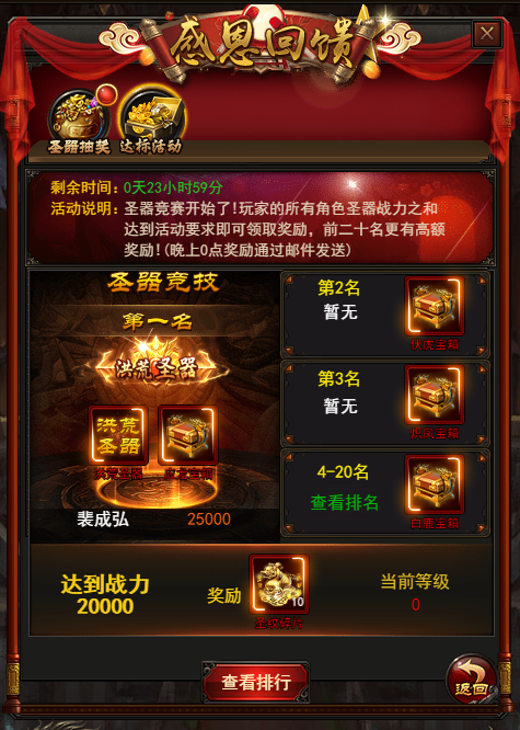 活动说明:活动期间圣器与圣纹战斗力达到指定要求,即可获得圣纹豪礼,第一名更有限定称号奖励。