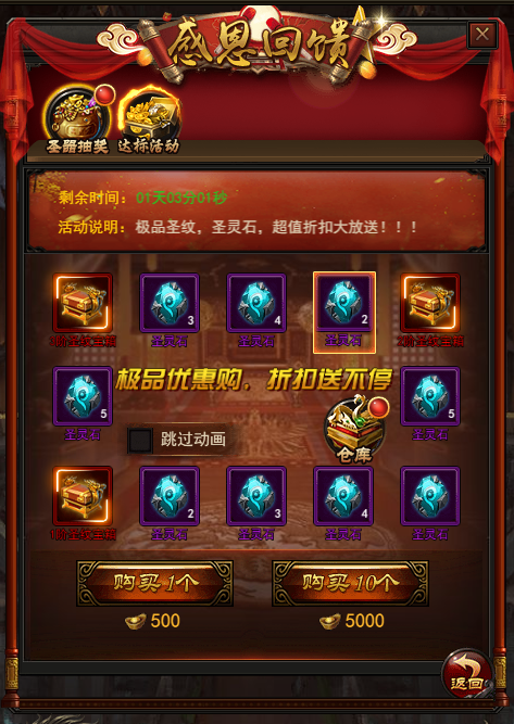 活动说明:活动期间消耗少量元宝,即可获取超值圣器升级材料,并有圣纹装备限时投放。
