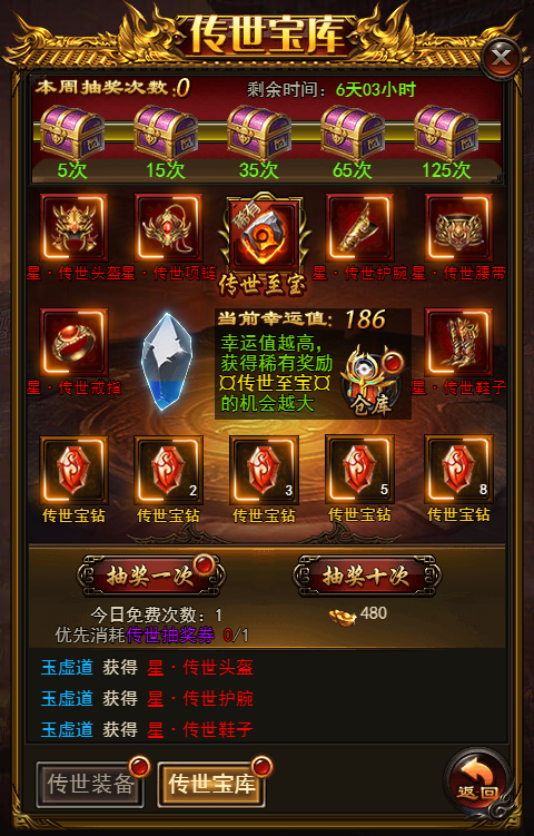 7. 玩家每天有1次免费抽奖次数,每周达到指定抽奖次数可以领取大量传世宝钻奖励。