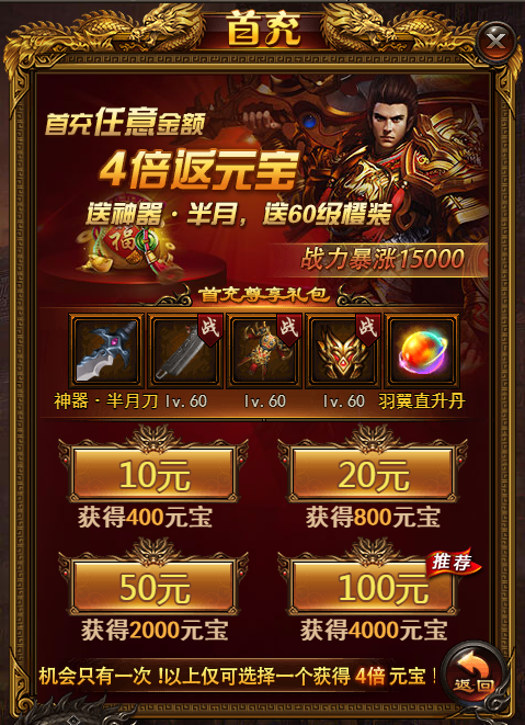 2. 首次充值指定档次可以获得4倍元宝,该4个档次只能选择1个档次充值。该4倍返利与2倍返利不会同时生效。