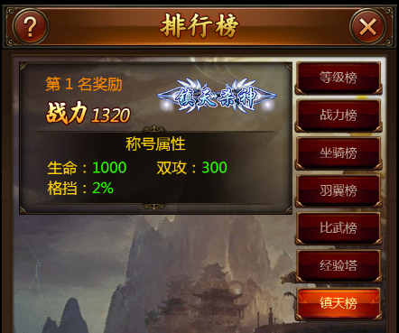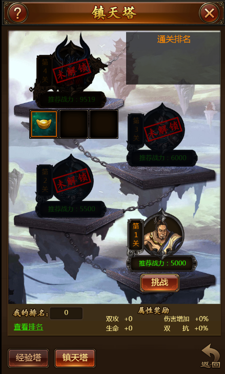 镇天塔:镇天塔内奖励大量属性加成,在规定时间内杀死塔层中怪物就可获取属性奖励,部分关卡还有元宝奖励。每天都有无数次挑战机会,大家可以尽情挑战自我,建议按照推荐战力进行挑战。镇天塔排名第一的玩家在每日零点都可获取到奖励,其中包含超酷炫的称号,千万不能错过!