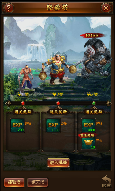 经验塔:顾名思义,经验塔可获取大量经验,每日不限挑战次数,每过一关都可获取经验,BOSS关首次通关还可以获得额外的10元宝奖励。每日0点重置关卡数,可以选择扫荡至最高关继续挑战。