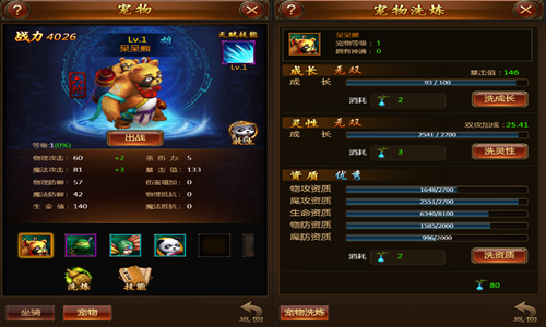 宠物是主角忠实小伙伴,当人物等级达到10级开启,开启宠物功能。宠物的品阶越高(1-7阶),基础属性就越高,加成到人物身上的战力也就越高。且宠物的属性除了与基础属性有关外,还可以通过洗炼提升宠物资质,以及提升宠物天赋技能,从而提升宠物属性。出战宠物对于主角角色有一定属性比例加成!