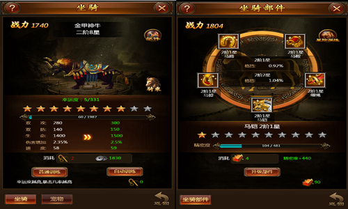 主角在5级时开放坐骑功能,主角骑乘坐骑后可以加成普通战力属性和隐藏战力属性(伤害增加)以及移动速度加成。不同阶数的坐骑有不同的外形。当角色等级达到55级后,开启坐骑部件功能。坐骑部件升阶同样的可以加成战力属性。