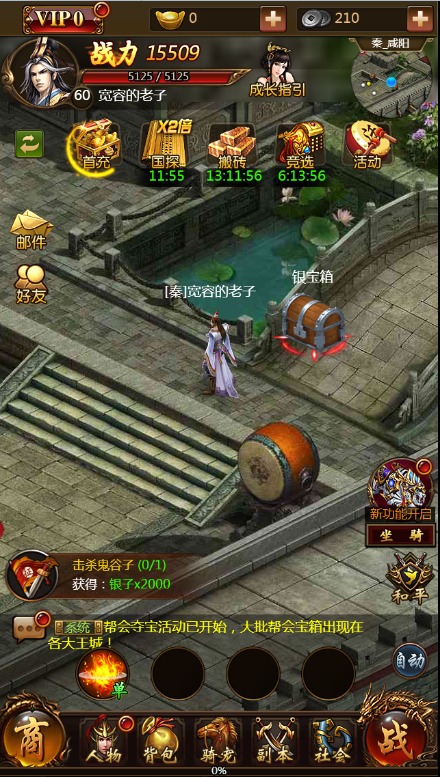 每天17:00系统会自动开启帮会夺宝活动,必须要加入玩家创建的帮会才可参与,加入新手之家是不可参与的哦!活动开启后在王城寻找宝箱击杀并上交后可以获取帮贡,帮贡可以在后期开启的帮会商店中购买道具哦!还可以击杀他人抢夺宝箱,趣味多多!