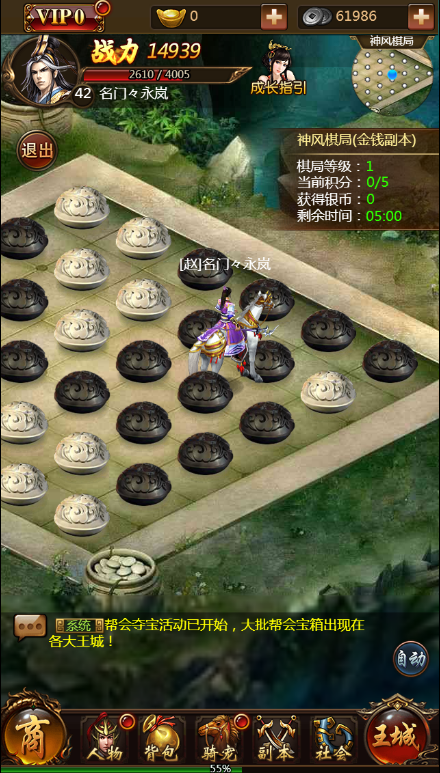 神风棋局:玩法副本,40级开启,每日可进入一次。棋局内有白色、黑色、彩色三种棋子,打掉白色棋子可以将其变为黑色棋子,黑色棋子反之,打掉彩色棋子可以炸掉周围一片棋子。五个相同颜色的棋子横、竖或斜相连可以消除并重新刷出棋子。消除可获取积分,积分达到一定要求棋局会升级。棋局等级越高,结算奖励越多。可获取元宝和银子奖励。