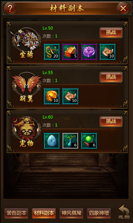 装备副本:25级可进入,不同等级区间可挑战不同难度的副本,副本内掉落各级装备和强化石,每日可进入1次,免费扫荡1次,付费扫荡1次,贵族5级增加一次付费扫荡机会。