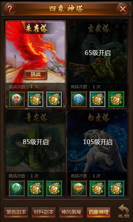 四象神塔:分为朱雀塔(45级开启)、玄武塔(65级开启)、青龙塔(85级开启)、白虎塔(105级开启),分别产出四种四象神石和宝石。未通关前,需要手动挑战,通关后VIP6可以进行扫荡,但若手动挑战就不可扫荡了。四象神塔对玩家的忽视防御和战力都有高要求,想要通关四象神塔首先要多对装备进行洗炼哦!
