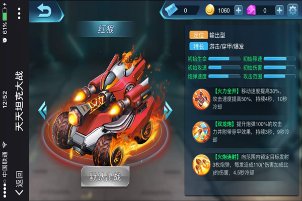 在进入游戏的时候小编选择了《红狼》这款坦克,为什么选择呢,是因为该坦克的技能以及灵活性,很适合在大乱斗中捡人头和击杀。