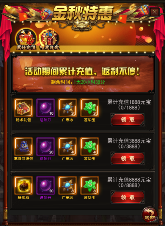 活动说明:累计充值一定金额,即可免费获得传世装备宝箱,金秋特戒宝箱,橙自律礼包,精炼石等极品道具赠送!!"