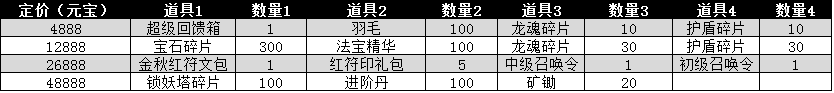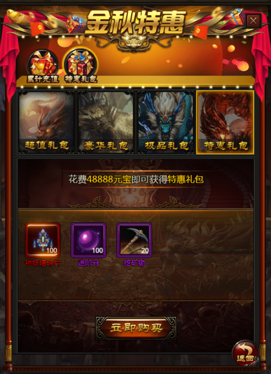 活动说明:超值特惠礼包限时购买,花费一定元宝即可购买|锁妖塔碎片,金秋红符文包,超级回馈包和宝石碎片等稀有物品!机会难得,不容错过!