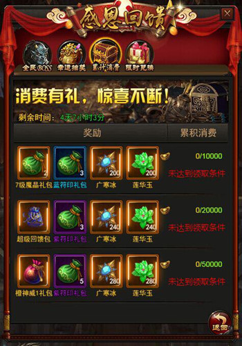 活动说明:活动期间消费指定元宝数,即可获得极品道具返利