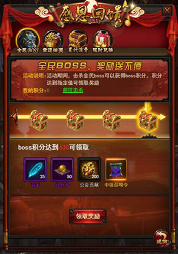 活动说明:活动期间,击杀全民BOSS即可获取积分,领取超值豪礼