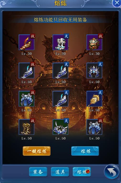 3:点击熔炼按钮弹出熔炼界面,点击熔炼就可以熔炼当前页面的装备,点击一键熔炼可以熔炼当前背包所有不需要的装备。熔炼可以获得相应的精炼石和银两,熔炼的装备等级越高得到越多。