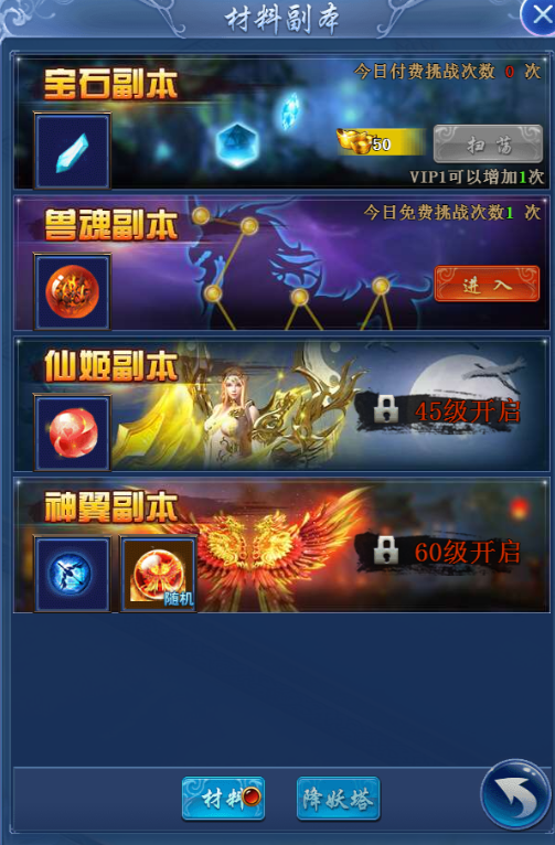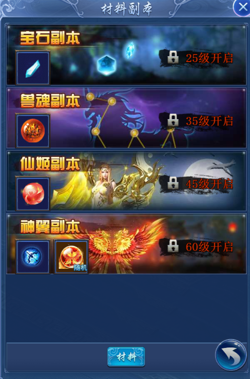 1:达到相应等级点击材料副本的进入按钮即可挑战该副本
