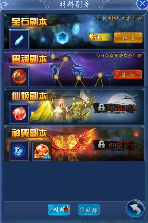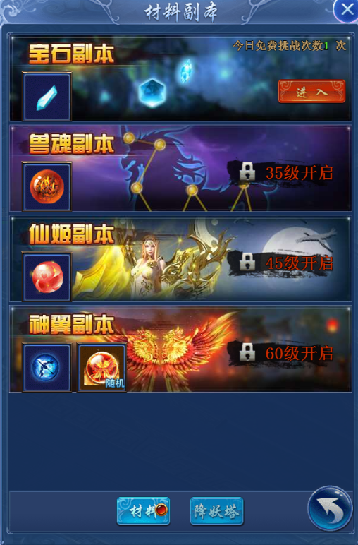 副本分为:宝石副本,兽魂副本,仙姬副本和神翼副本。达到相对应的等阶即可开启相应副本。