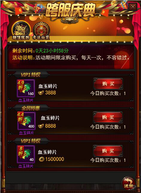 第1天:(vip1)3888元宝 血玉碎片*160