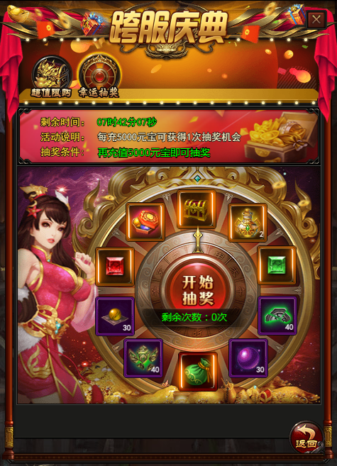 活动说明:活动期间每充5000元宝可获得1次抽奖机会。