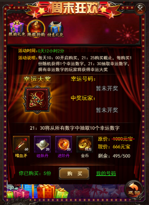 活动说明:每天10点开启购买,每份礼包赠送一个幸运号码,每日21:30抽取10个幸运号码,发放终极幸运大奖。
