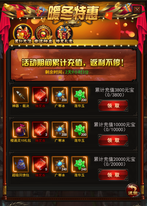 活动说明:活动期间充值指定元宝数,即可获得极品道具返利