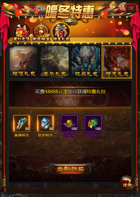 特惠礼包(48888):麻痹戒指碎片*50护身戒指碎片*50经脉丹*100血玉碎片*100