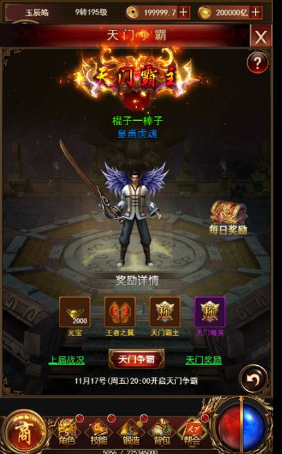 天门占领帮会将获得特殊殊荣,将在天门争霸主界面上显示占领帮会的会长形象,会长可以获得天门霸主与王者之翼,且该帮会的成员每日可以领取占领天门的奖励
