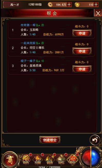 创建与加入:玩家70级后开启帮会玩法,点击主界面上的帮会按钮,可以打开帮会主界面。帮会系统开放后,玩家可以自己创建帮会,创建帮会需要消耗一定的资源,创建人自动是帮会会长。玩家也可以选择申请加入一帮会,加入成功之后默认是会员。
