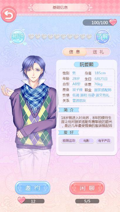 游戏中设置8位不同类型的男神,想和他们亲密接触那就要提高友好度并确认关系,为了和男神出游我们也要精心做一番打扮。