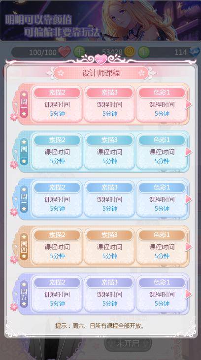 每种职业都有相应的课程表,需要特别注意的是,周一的课只能周一上,周二上不了周一的课程(周六和周日可以随便上课)